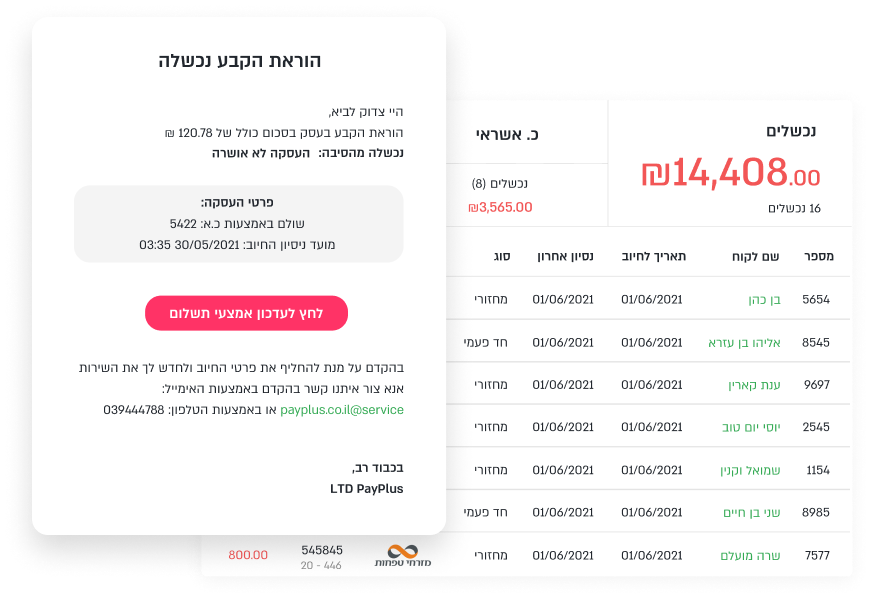 צמצמו את אחוזי הנטישה באמצעות נסיונות חיוב חוזרים. הודעות דוא"ל אוטומטיות לגבי תשלומים שנכשלו ועדכון כרטיסים אוטומטי.